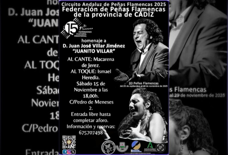 El Circuito Andaluz de Peñas Flamencas de la provincia de Cádiz rinde homenaje este año al legendario cantaor Juan José Villar Jiménez —más conocido como Juanito Villar—, nacido en Cádiz en el año 1947.